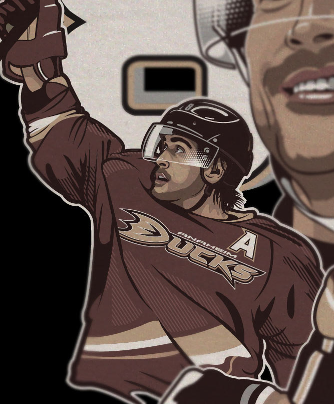 On Jan 11, 2015. For the retirement of NHL's "Finnish Flash" Teemu Selanne's number 8, the Anaheim ducks collaborated with the hockey lifestyle line Violent Gentlemen to create limited edition t-shirts to celebrate such an occasion. I was commissioned to create a piece that showcased Selanne's portrait, action shot in a retro hockey poster composition. These officially licensed NHL shirts are available while quantity lasts at the official NHL store TEEMU FOR8VER!