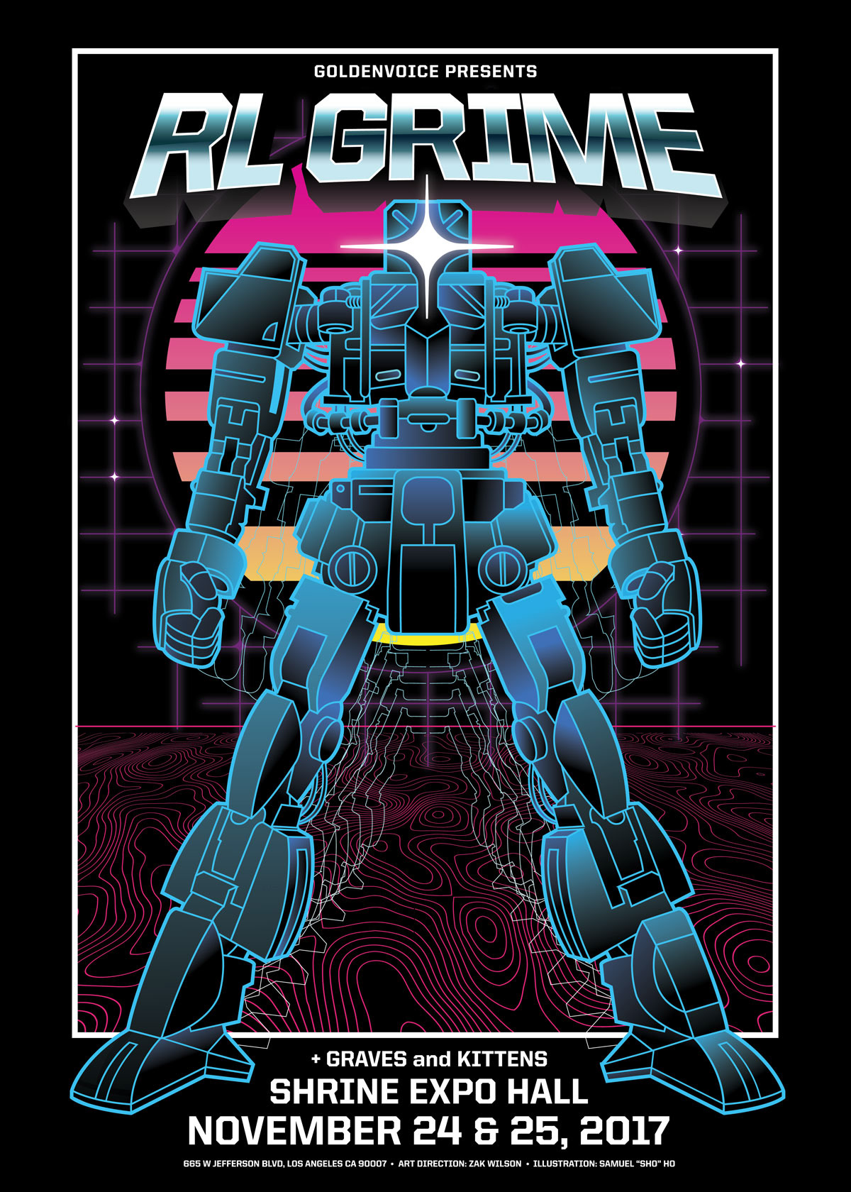 I was commissioned to create a gig poster for Trap / EDM artist RL GRIME! If you don't know who he is keep an eye on him! He recently had his music featured with the launch of Rihanna's cosmetic line Fenty Beauty. The art direction was 80's techno wave something I've always loved doing. On his new NOVA tour he has an amazing robotic stage that rises when he's playing music so I used that as inspiration for the mech robot motif.