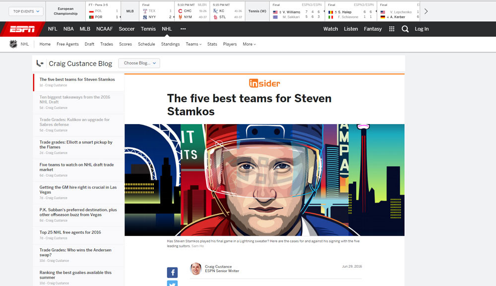 For an ESPN Insider article I was tasked to create 5 different images of Steven Stamkos' short lived free agency. Though he ended up choosing to stay with the Tampa Bay Lightning it interesting to create him dawning the potential jerseys of Detroit, Toronto, Montreal and Buffalo.