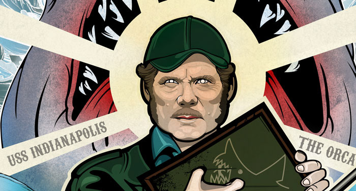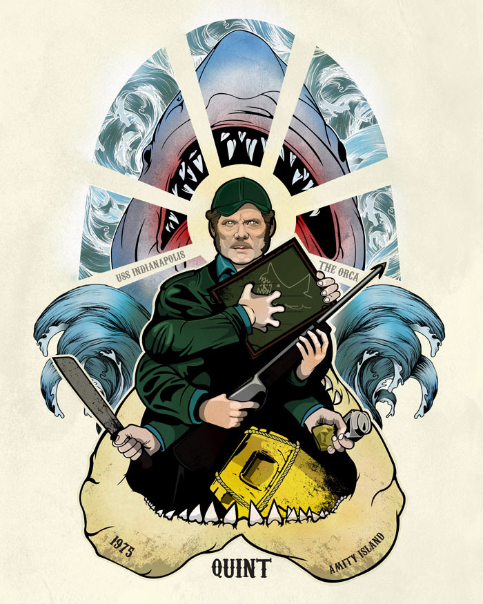 Artist Notes: Quint was an awesome mysterious character that you would warm up to and embrace till the very end in the iconic movie "JAWS" His display of heroic know how and determination and Indianapolis speech makes him an idol amongst seafearers and movie lovers alike.